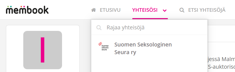 - Etusivulla yläpalkissa on valikko. Paina valikosta kohtaa ”Yhteisösi”, josta tulee esiin lista kaikista yhteisöistä, joiden jäsen olet.
