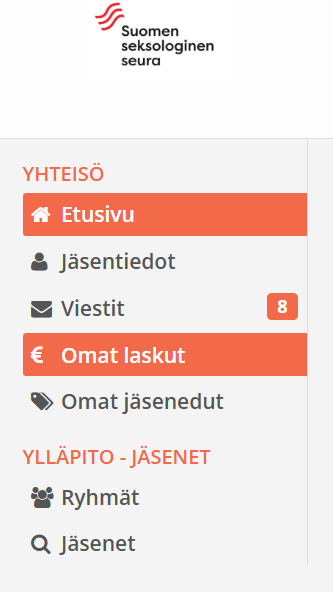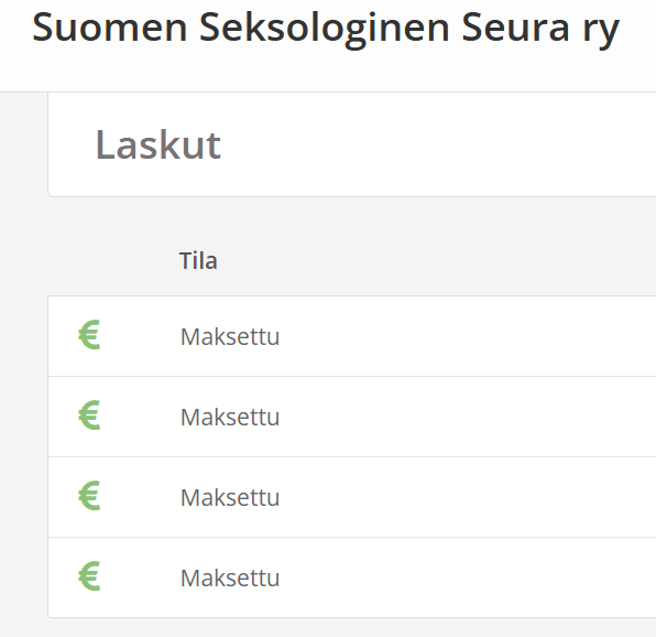 - Kun kaikki laskut on maksettu, ja laskut- näkymä näyttää samalta kun alla olevassa kuvassa (kaikkien laskujen kohdalla lukee ”Maksettu”, voit siirtyä seuraavaan kohtaan, eli päivittämään jäsentietojasi.