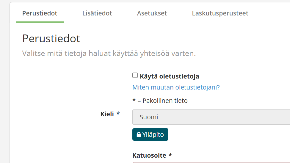 3. Täytä ”Perustiedot”- välilehdelle kaikki tarvittavat yhteystiedot. Näitä ovat: