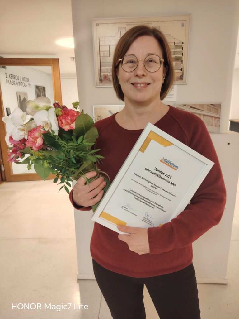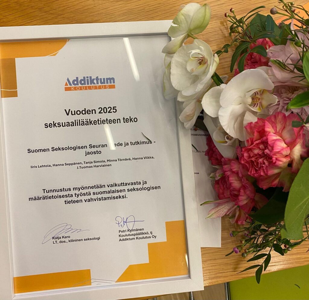 Suomen Seksologisen Seuran pitämä Tiede ja tutkimus -jaosto palkittiin Addiktumin Valtakunnallisilla seksuaalilääketieteen päivillä Helsingissä 5.2.206.